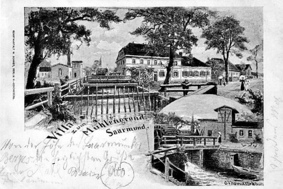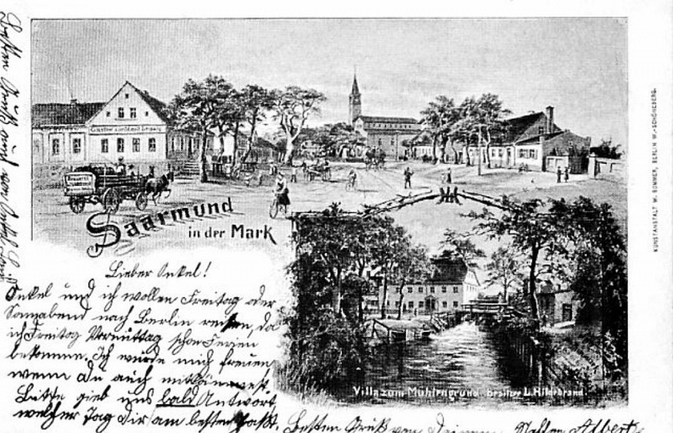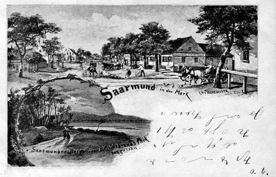 Die früheste Urkunde mit der Erwähnung Saarmunds ist uns aus dem Jahre 1217 überliefert. Es handelt sich um eine Kirchenurkunde des Bischofs Siegfried von Brandenburg. Die Bezeichnung Saarmund, soll sich einfach von dem Einmünden des Saar(e)grabens, eines springlebendigen Gewässers, in die Nuthe herleiten.